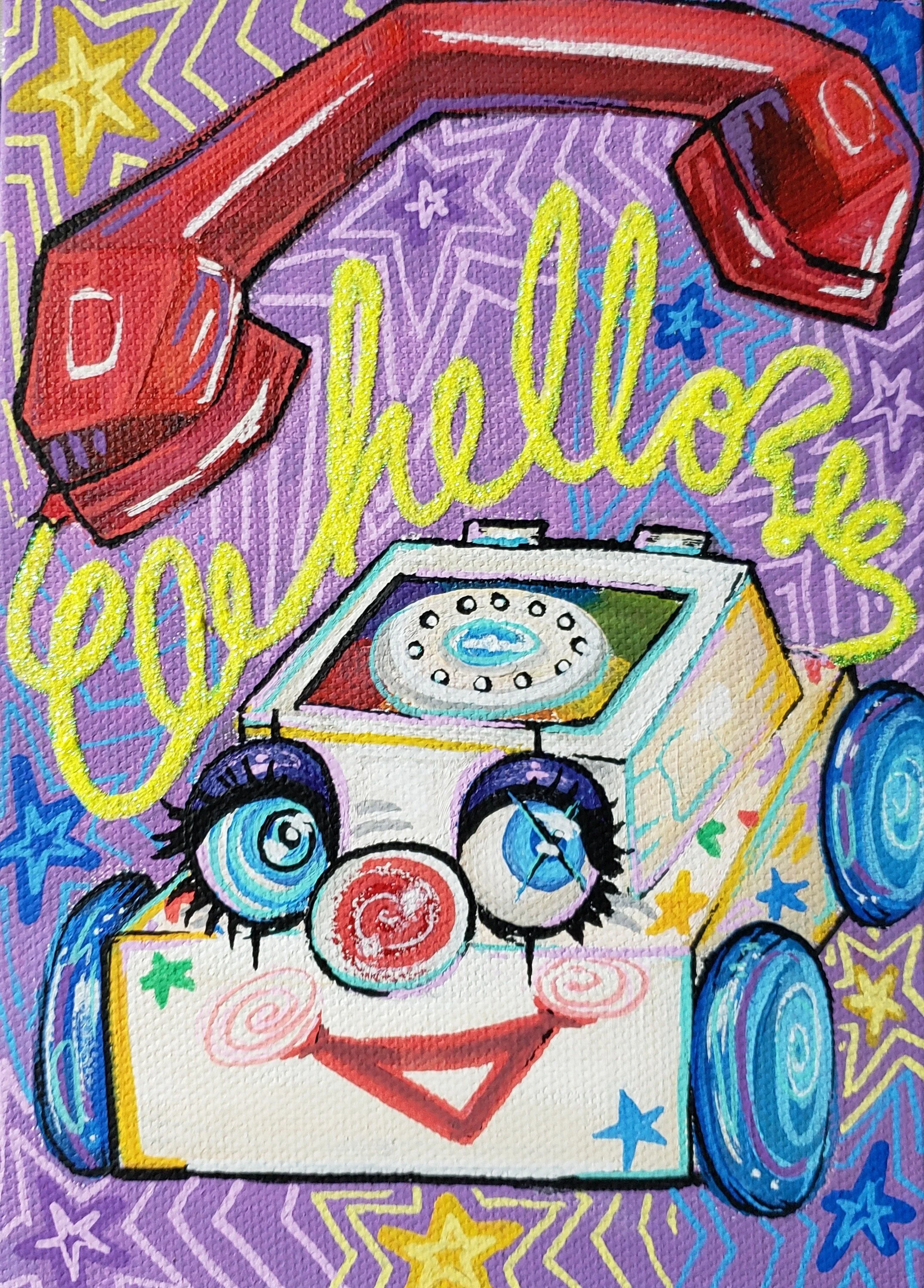acrylic and glitter on canvas panel. 5x7”. painting of one of those old playskool phone toys.