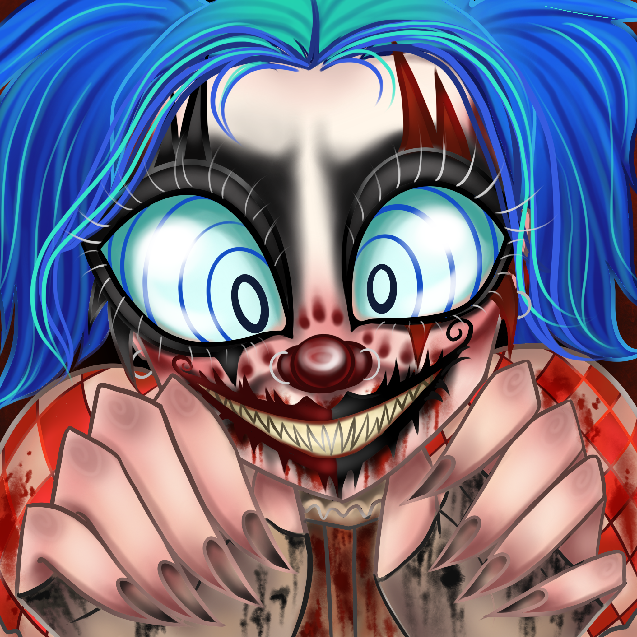 acrylic, glitter, and fake blood on canvas. 5x7”. bats the clown eyes, created as the header for my old shop, art by bats. also used as the reference for the handpainted bats hoodies !