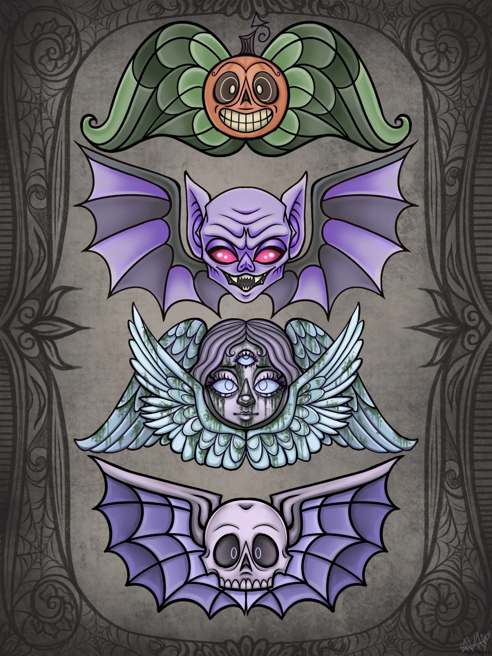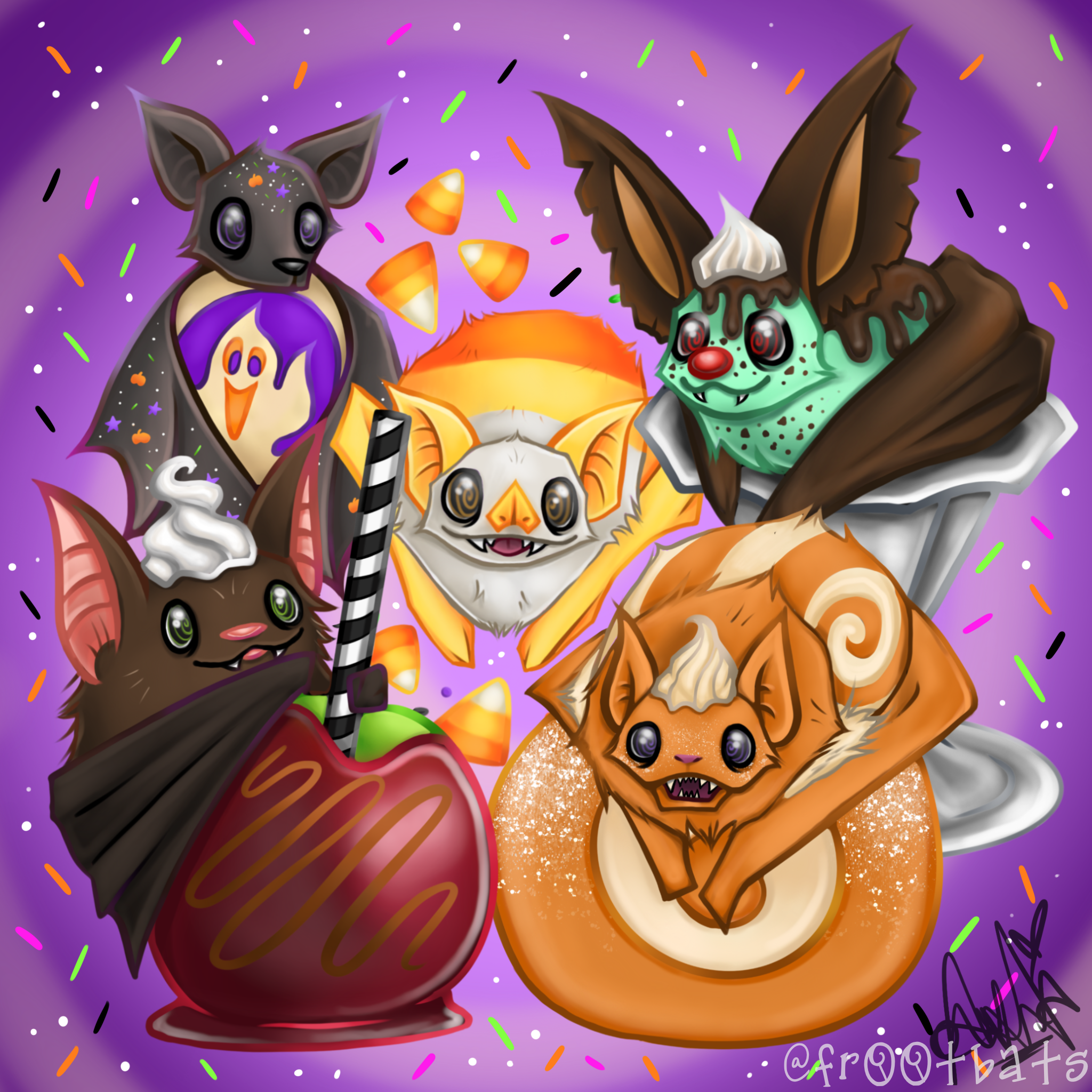 dessert bats!! each based off a diff halloween dessert. originally done for my patreon. done on procreate