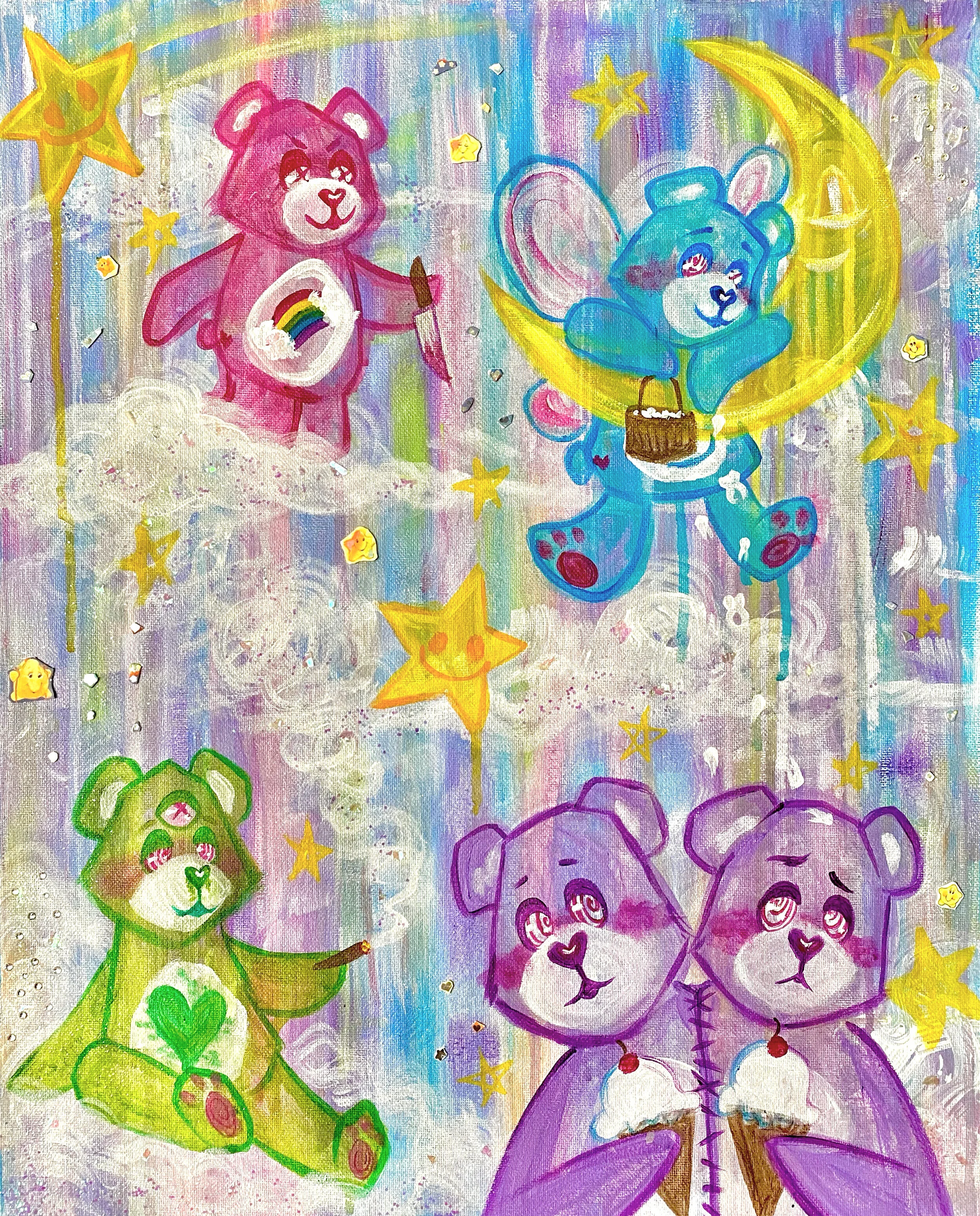acrylic and glitter on canvas. 16x20”. care bears but not.