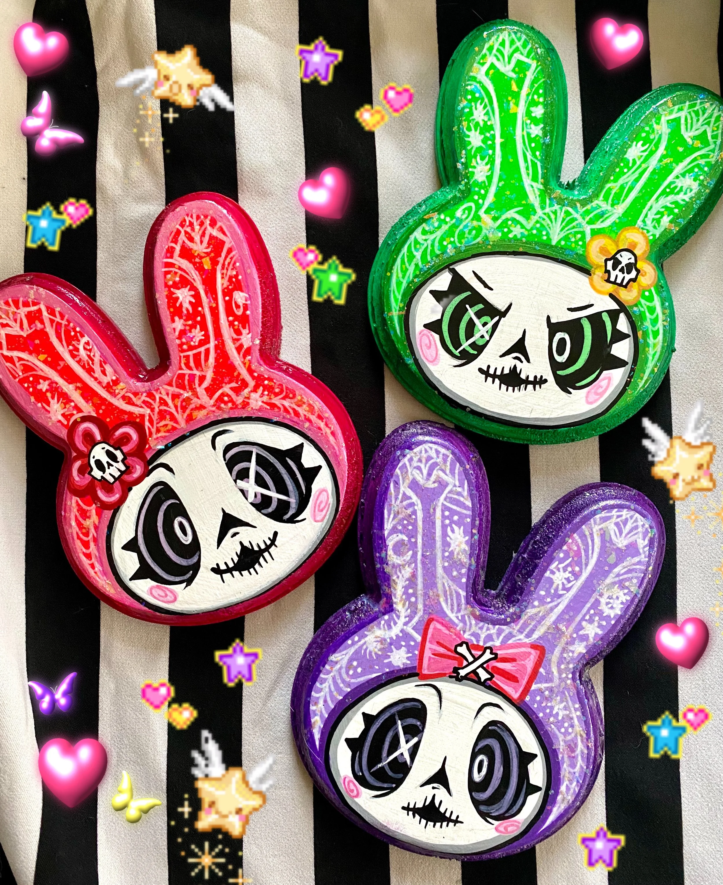 acrylic on wooden plaque. painting of a halloween version of the cybunny neopet.