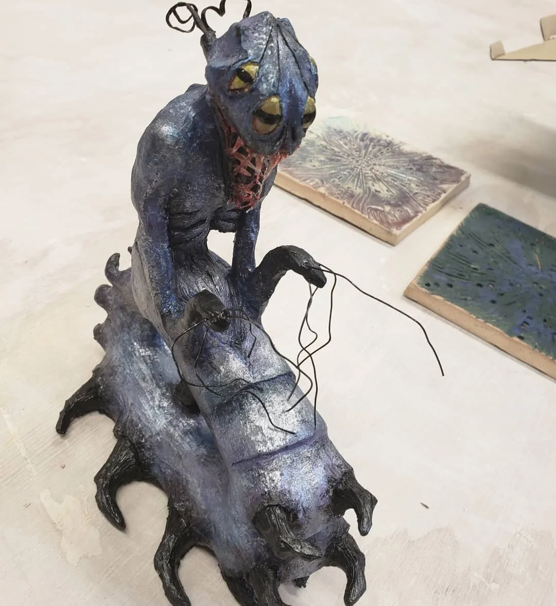 acrylic paint, thermoplastic, wire, and blood gel on ceramic sculpt. created for a college ceramic class in place of wheel throwing.